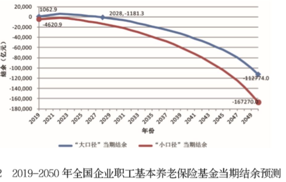 《报告》预测,未来30年我国的制度赡养率翻倍,2019年当期结余总额为1062.9亿元,不过到2028年,当期结余可能会首次出现负数,为负1181.3亿元。