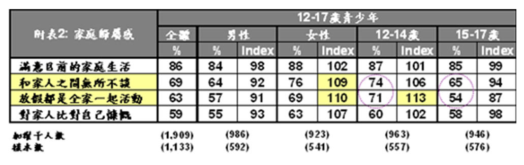绝大多数的青少年满意目前的家庭生活,然而,他们与家庭成员关系的紧密度,却因性别与年龄而部分不同。青少女与国中生中,有较高比例与家人无所不谈、放假时与全家人一起活动 。上高中后的青少年开始发展出『自己的』世界,渐渐地从『以家庭为主的生活模式』中出走。 (参考附表2)