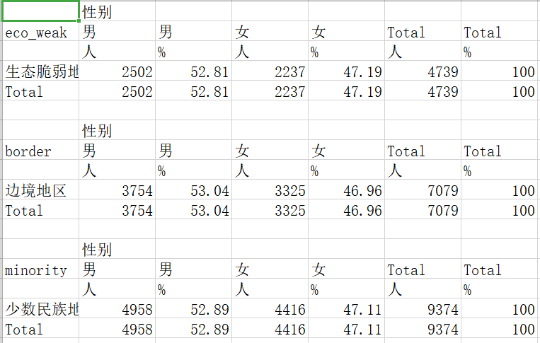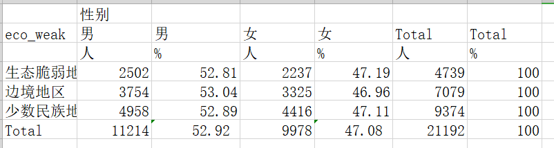 问题:使用tabout语句导出表格,在原始的数据库中eco_weak,border,minority都是分开的三列(因为是根据地名生成的),所以导出的时候,每一行下都带了total。