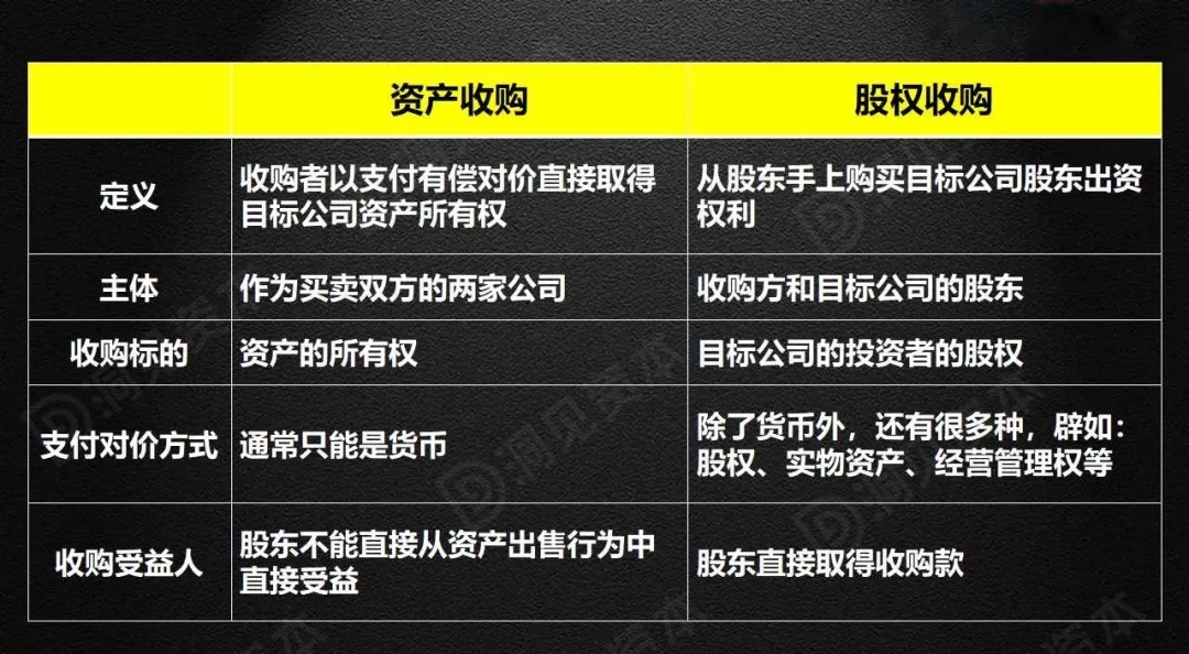 导语公司并购是涉及目标公司控股权转移的各种产权交易形式的总称,投资者进行并购的目的通常是为了获得目标公司的资产、技术、经营权或市场等,一般以购买目标公司的资产或股权方式进行,也就是通常所称的“资产收购”和“股权收购”。