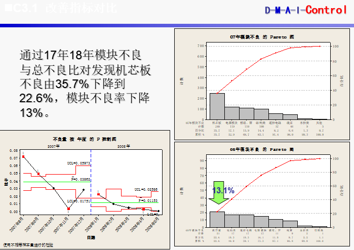 这是我们的六西格玛顾问专家与客户的技术团队,历时一年多的时间,攻克了客户(某电子产品制造商)最头痛的项目之一:**机芯,因质量水平不达标,险些被他们的客户(国际著名的品牌商)取消订单与合作。(通过17年18年模块不良与总不良比对发现机芯板不良由35.7%下降到22.6%,模块不良率下降13%;