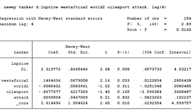 本人基于时间序列数据进行多元线性回归。首先对各变量进行了平稳性检验,发现只有国际油价对数lnprice为非平稳。通过一阶差分进行修正。之后进行多元线性回归,结果如下: