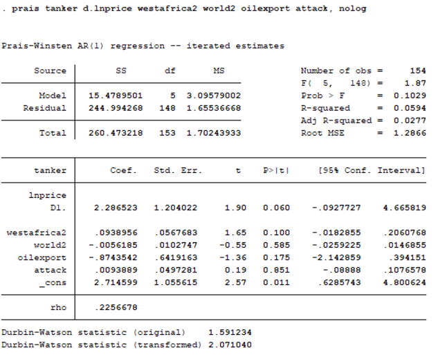 检验发现残差存在自相关,决定采取异方差自相关稳健标准误(HAC)和可行广义最小二乘法(FGLS)进行补救。