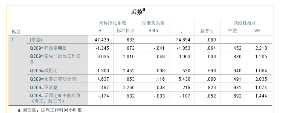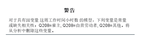 我在做一个劳动时间的影响因素的多元线性回归模型。因变量是劳动时间,自变量有劳动合同和就业身份,当只把就业身份纳入模型时,能输出系数,但是把劳动合同纳入模型时,spssj就输出了警告:下列变量是常量或缺失相关性。本来就业身份有五类,但现在只有两类保留了,其他三类被排除了,请问这是什么原因呢?时多重共线性的问题吗?