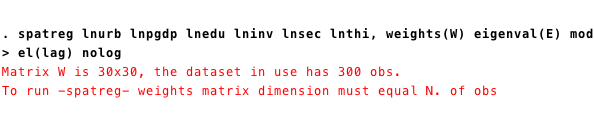 帕瓦娜 发表于 2020-8-23 21:32 你的命令适用于截面数据 xsmle lnurb lnpgdp lninv lnsec lnthi,wmat(w) modle(sar) robust nolog//适用于 ...