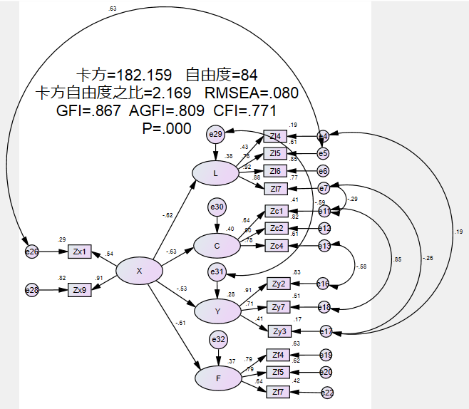 4、大家看我最后的模型这样可以吗?都没有大于0.9,连接了好几对残差,实在是没有其他办法了,删了一些观察变量,指标还是降不下来