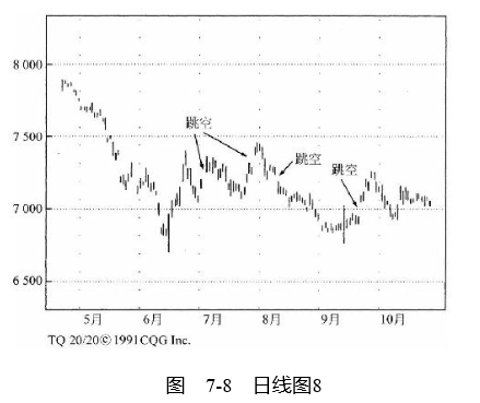 注:1989年12月份日元期货——一个对消息面非常敏感的市场。外汇市场对消息面相当敏感,因为中央银行可以操纵供给面。请注意,每天的开盘价经常跳空,趋势的变动也非常快。除非在适当的情况下,否则在外汇市场建立投机头寸的风险很高。