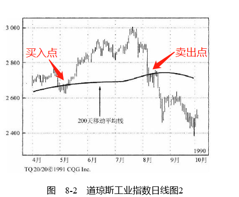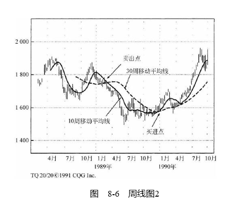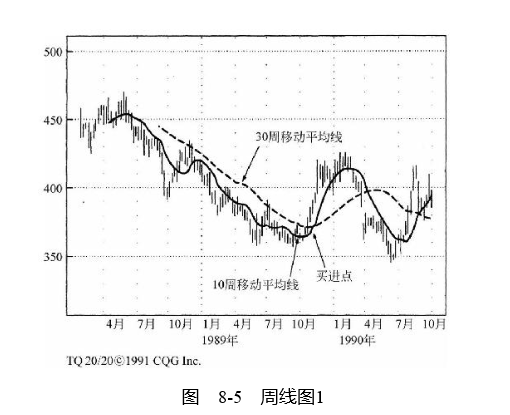 注:黄金期货周线图——10周/30周移动平均线穿越准则的买进点。当10周移动平均线穿越30周移动平均线,而两者的趋势都向上时,则代表买进信号。