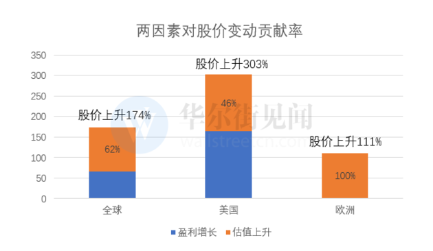 报告称,在这轮经济周期中,利润率的增长对盈利贡献占比超过60%。其中美国企业的利润率较金融危机 前的峰值高出约280个基点,而欧洲企业利润率仅高出40个基点。并且,欧洲企业的股价上涨与企业盈利增长几乎没有关系,完全是由股票估值拉动。