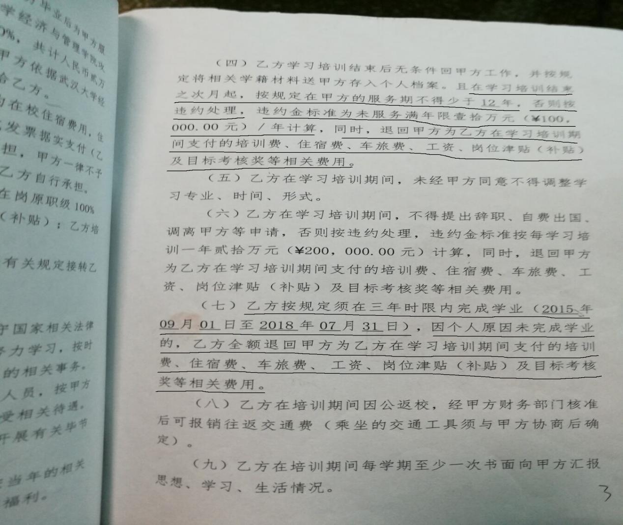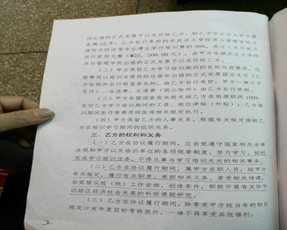 小雨2015年向单位提出申请,并顺利考上武汉大学博士研究生。然而这并不是福音,而恰恰是噩梦的开始。因为单位在培训合同中提出了许多极为无理的条件。硬性要求三年必须毕业,否则要赔偿单位一大笔钱。毕业后服务期为12年至15年,少服务一年必须赔偿十万,另外还要赔偿所有的工资、津补贴、目标考核奖、五险一金等费用。同时还要积极承担单位的科研任务,服从单位管理。面对这一极不公平的合同,小雨找到校领导反映,领导指示去跟人事处协商。找到人事处,人事处以合同是由办公室拟的为由,让他去找办公室。找到办公室主任,办公室主任说你还在找领导反映。如此循环多轮。由于武大规定定向的博士转非定向是转不了的。由于考博不易,怀着对学术的追求,无奈之下,只能在15年8月份签下这份合同。