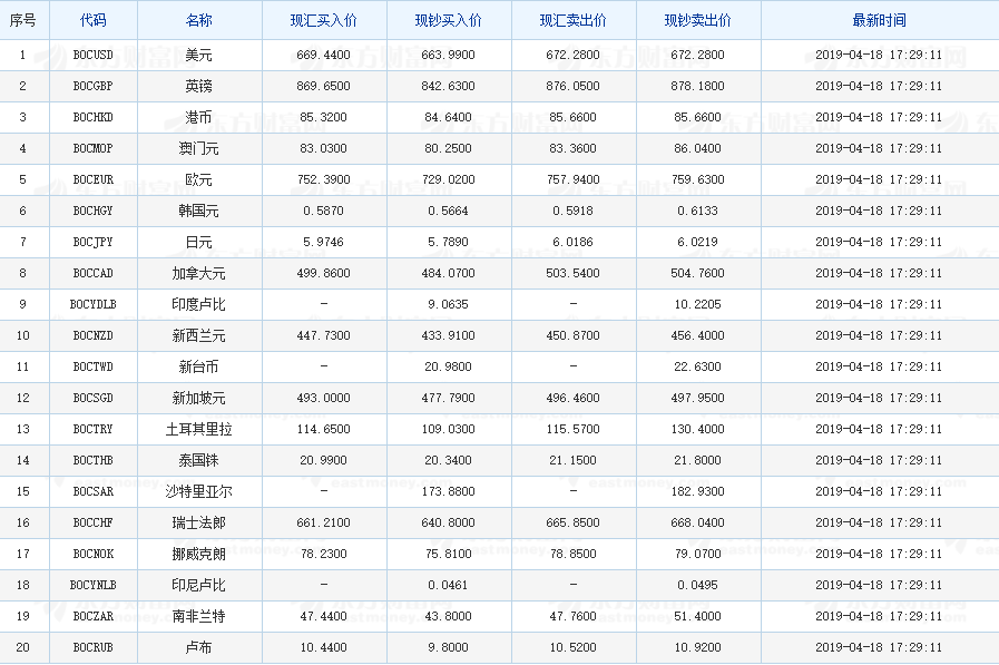 中国银行外汇牌价 2019-04-18(图片来源:东方财富网)