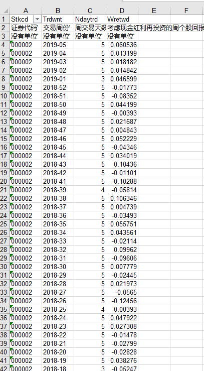 想请问一下,从CSMAR里面导出股票收益率数据,直接出来的是这个图,第一列是股票代码,第二列是交易周数,股票代码重复了很多次。想请问一下怎样才能变成下面这张图这样,用行来表示股票,用列来表示时间。谢谢各位大佬了