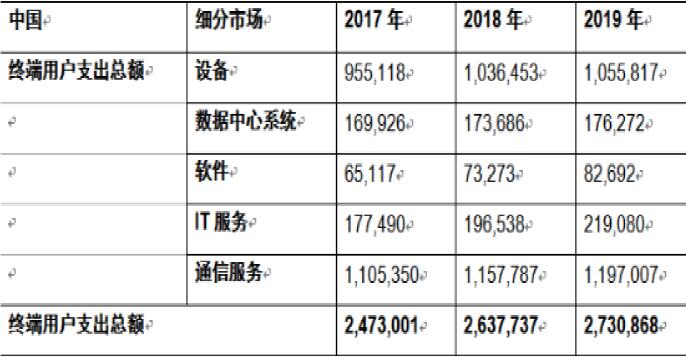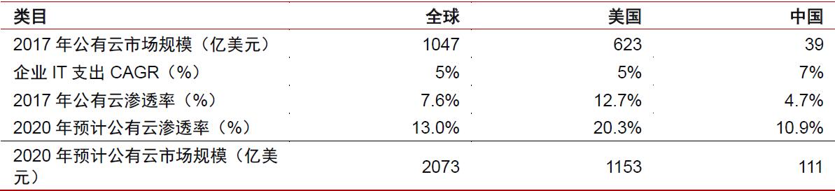 作为云在未来会逐步渗透和替代的“潜在市场”,中国IT开支规模将望随着经济体量的持续增长及信息化的不断推进逐步缩小与美国差距。根据中为慧数信息最新预测,2017年全球IT支出3.5万亿美元,中国IT支出2.4万亿人民币,占比约为9.92%,相对于中国GDP在全球占比(~15%)有显著提升空间。同时随着中国经济体量持续增长并逐步接近美国及中国信息化进程持续推进,中国IT开支在量级上有望与美国(~7000亿美金)接近。