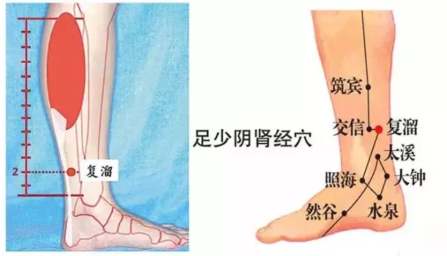 六味地黄丸:复溜穴复溜穴,属足少阴肾经穴,复溜穴就是要让停留下来的水又重新流动起来的意思。它位于小腿内侧,太溪穴直上2寸,跟腱的前方。