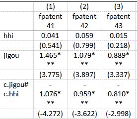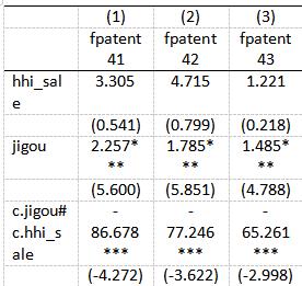 该部分参考Aghion(2013)的文章,研究机构投资者持股(jigou)、行业竞争度(hhi)与创新(fpatent41、fpatent42、fpatent43)之间的关系。参考Aghion(2013)以及国内文献做出来的hhi以及机构与hhi交乘项的系数特别大,不知道该如何解释,如图所示;而国内外文献系数都个位数(绝对值小于5,更多在±1左右)。因此,我想把系数降下来,然后就将hhi标准化后进行回归,结果系数降了下来,应该能参照别人文献做出相应的解释。但是我请教了他人,说“不要乱用标准化处理”。因此,想在论坛得到准确答案,这个能否标准化处理?如果不能,能否有更合理的办法将系数降下来或者就未标准化得出的系数较大的结果做出合理解释?谢谢各位,烦请各位略指一二。