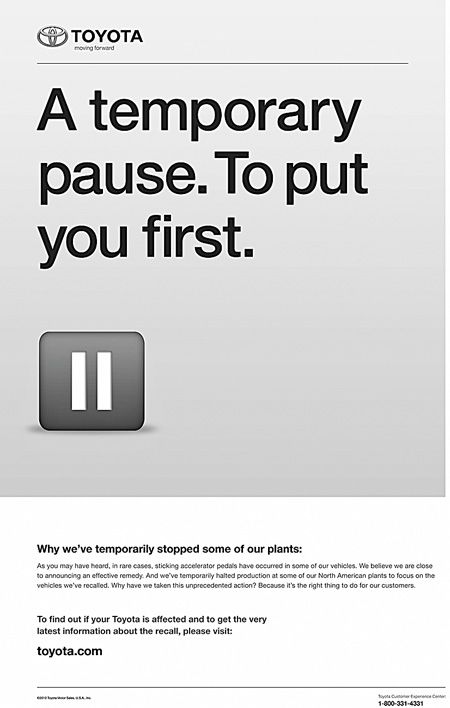 丰田刊登全版广告,表示停产停售只是「暂停动作」,北美销售营运长兰兹上节目打公关战。(美联社)