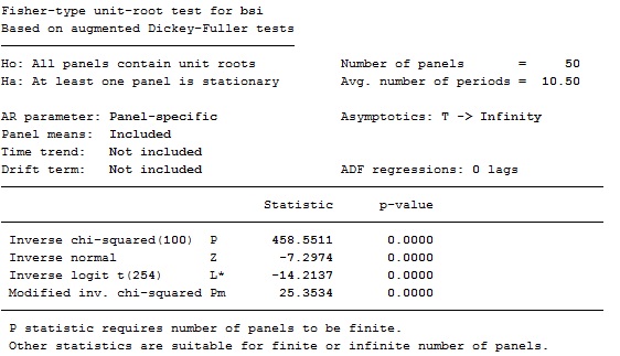 各位大神,我是stata小白一枚现在正在写轮文,利用Fisher-ADF检验来做非平衡面板数据的平稳性分析,然后想把检验结果展示在论文当中,我需要选择检验结果当中的哪一个P值,还是说把四个P值都展示出来?下图展示的是检验结果,希望大神能回复下!先谢谢啦! 无标题.jpg