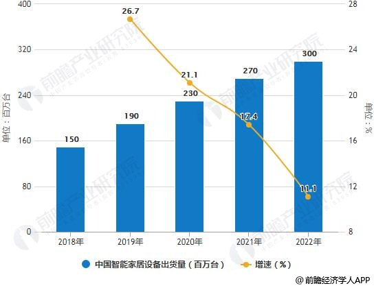 2018-2022年中国智能家居设备出货量统计及增长情况预测