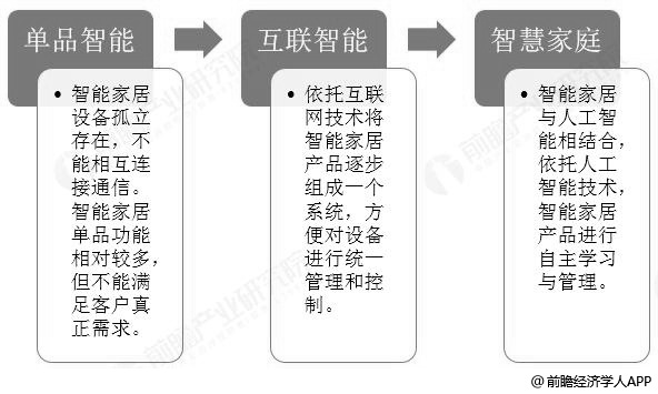 智能家居系统从产品形态上可分为单品智能化、单品之间联动智能以及系统智能化三个层次: