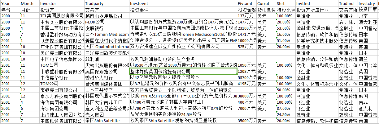 I5158 发表于 2019-5-30 17:16 楼主,附件一对外直接投资事件是从哪个数据库里下的呢?尤其是投资时间和国家~