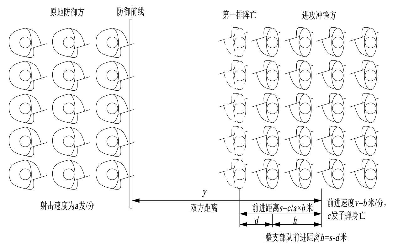 那么进攻方最前排的生存时间t为c/a分钟,第一排前进的距离s=vt=b×c/a米,由于第一排此时已经阵亡,第二排变成第一排,整支军队的前进距离h=s-d米,所以每一排的士兵的阵亡可以换取整支部队前进h米,而敌对两军相距y米,就需要阵亡y/h排士兵才能冲锋成功。每排士兵的生存时间是c/a,那么冲锋需要的时间T=y/h×(c/a)分。