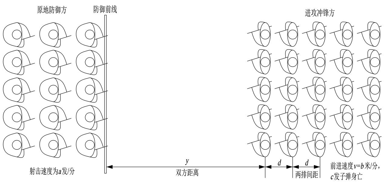 防御一方在防御阵地,使用火枪射击冲锋的敌人,当防御方最前排有战友死亡时,后一排的士兵进行补缺,继续进行射击。进攻方一边持枪射击,一边向敌人冲锋,第一排的士兵可以看做是第二排士兵的盾牌,当进攻方冲进防御方阵地进行近距离火拼时,则表示进攻方冲锋成功。我们假设进攻方第一排距离防御方的距离为y,两排的间距为d,进攻方前进速度v为b米/分。防御方的射击速度为a发/分,平均c发子弹打死一个敌人(如图1所示)。