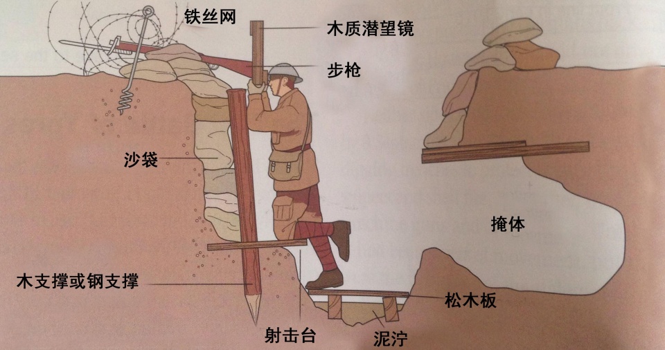与之前的战争相比,一战的堑壕战是一战的主要特点,而三种工具则是堑壕战的主要工具,包括铁锹、铁丝网和机枪。铁锹用来挖战壕来隐蔽自己,降低自己被射中的概率。铁丝网用来降低进攻方的冲锋的平均速度,这样进攻方就很难突破防御阵地。机枪增加了子弹的发射速度,大大增加了进攻方的伤亡。另外,之前的单线防御演变成多线防御,多条战壕平行布置,增加了进攻方的冲锋距离。