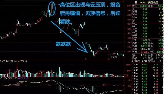乌云压顶(Dark-Cloud Cover)经常发生在一段上升行情的顶部,由一阴一阳两根K线组成,阴线在阳线收盘价之上开盘,在阳线实体内收盘,形成乌云盖顶之势,显示行情走软,阳线实体被阴线覆盖的越多,表明买气越弱,空方攻击力度越大。