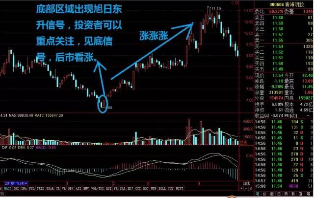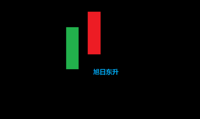 旭日东升是上涨形态。在下跌趋势中,出现一根中阴线或大阴线,紧接着出现一根高开的中阳线或大阳线,阳线的收盘价高于阴线开盘价,意味着多头力量较强,此种形态称为旭日东升。这种情况最好是配合下成交量看。