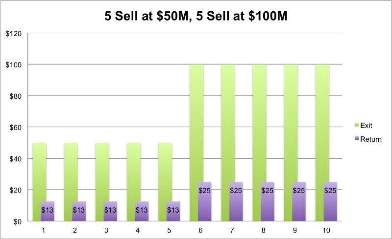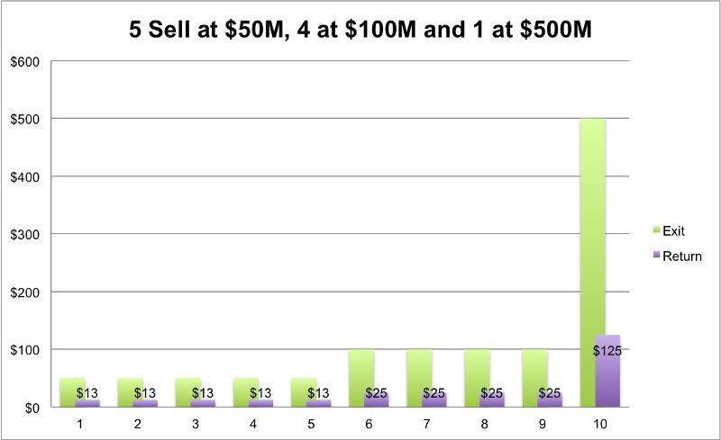 VC在10个公司5000万美元估值的时候退出,每个公司占股25%,一共可以获得1250万美元的回报,那么10年期的回报就是:10*1250万美元=1.25亿美元。但是我们需要的是3亿美元,这没有达到我们的要求,那么接下来,假设VC会做出更好的业绩。
