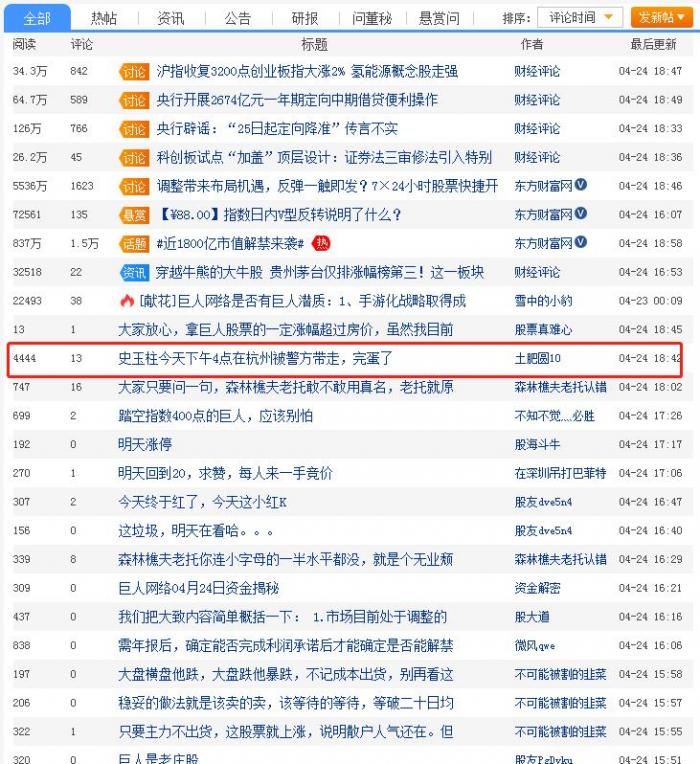 该高管提供的一则截屏显示:4月24日18:42时,用户名为“土肥圆10”发出“史玉柱今天下午4点在杭州被警方带走了,完蛋了。”