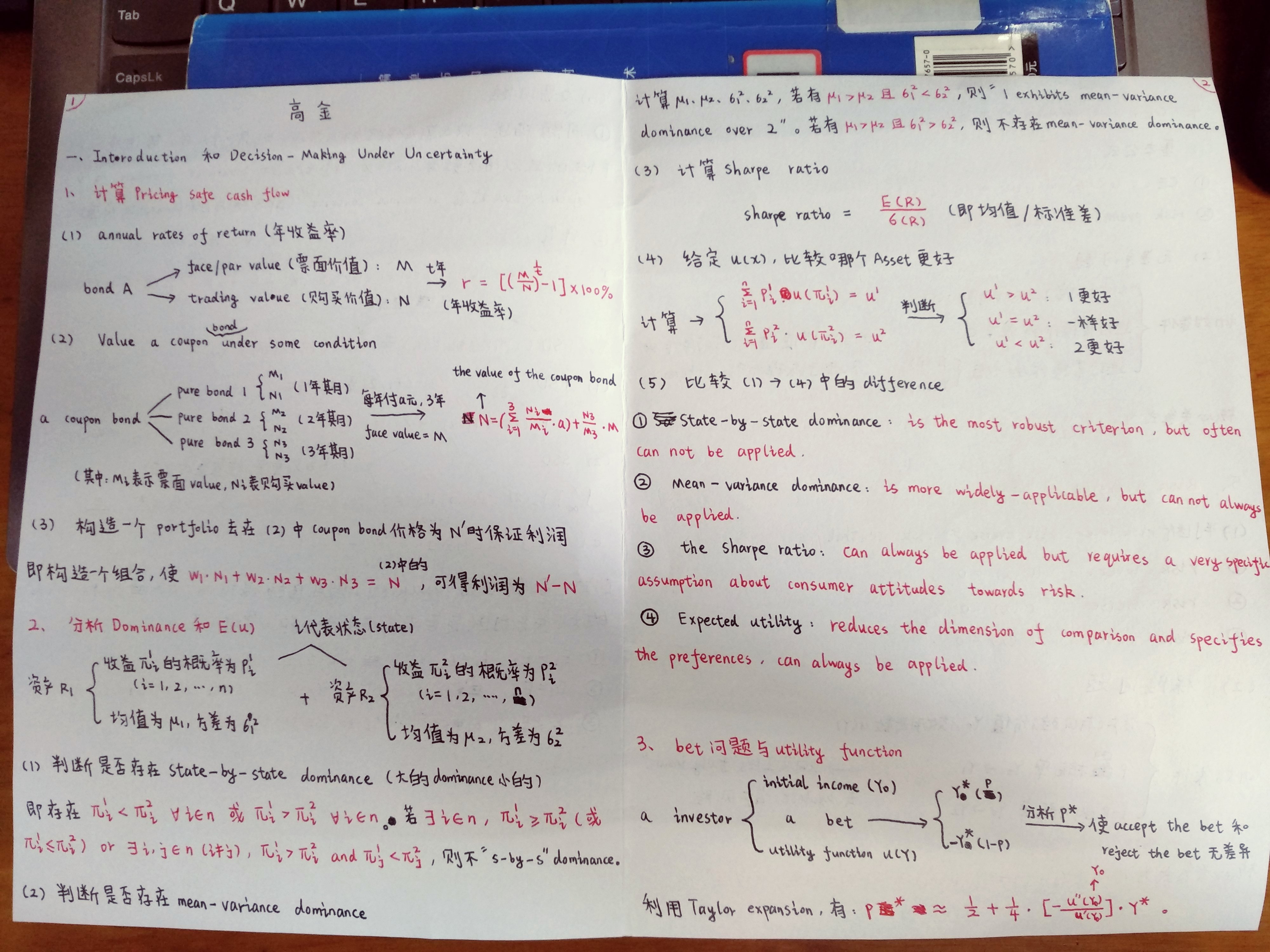 RT。本人在复习高级金融经济学(期中)时所做的原创笔记,这里收一点原创辛苦费