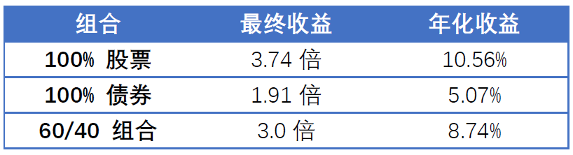 但是继续往下看,你就会知道分散投资的60/40组合相比于100%股票,不仅风险更低,而且收益也更优!