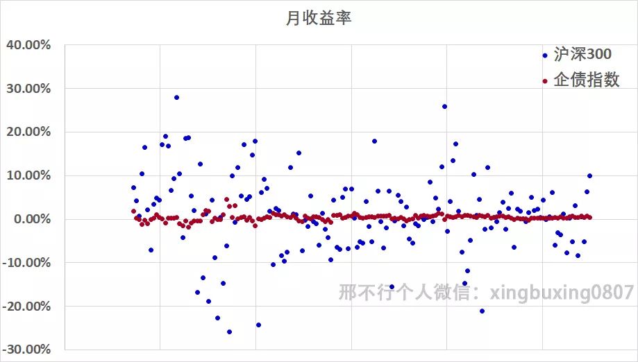 而企债指数的月收益率基本上在0.4%左右,几乎没有发生变化,这个数据的标准差就很小,对应风险小。