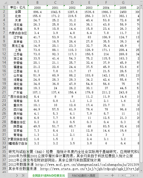 全国及31省R&D经费支出、R&D投入强度数据(即占GDP的比重)-(2000-2018年)