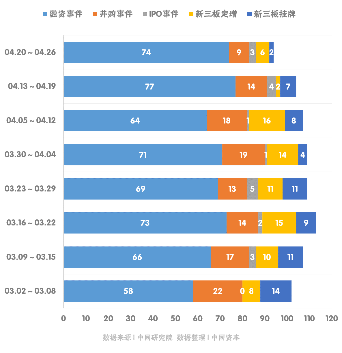 2019.04.20~04.26,本周「投融资周报」共收录投融资事件 74 起,并购事件 9 起,IPO事件 3 起,新三板定增 6 起,新三板挂牌 2 起。近30天内,全球资本市场交易金额排名前三的行业分别是 矿产资源 ¥321.6亿、企业服务 ¥282.8亿、医疗健康 ¥249.7亿,投资事件数量排名前三的行业分别是 医疗健康 173起、企业服务 151起、金融 75起。