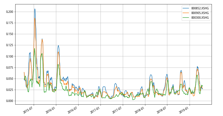 上图就是三大指数的波动率情况,还是同一个时间段,我们使用移动窗口标准差,再除以该窗口期内的价格均值,去价格量纲得到这个曲线,通过研究平台文件我们输出波动率具体值为: