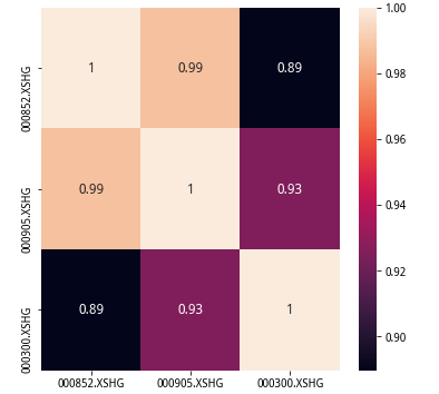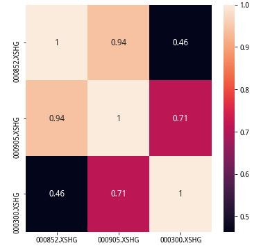 绘制相关性矩阵需要导入 seaborn 包,其 heatmap 函数就是专门用于热力标色的矩阵图绘制的。分析结果显示,三大指数的走势相关性并不十分高,特别是沪深 300 和中证 1000 差异最大。而波动率相关性分析则体现出更高的结果,说明在出现较大波动时刻,指数的共振还是很明显的,这表现出较高的系统性风险。