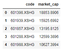 二、指数成分股市值特性分析我们进入所有聚宽的老用户们最熟悉的 get_fundamentals 函数,通过调取 valuation.code、valuation.market_cap 这两项数值,获得股票代码和市值数据,并打印前5行,获得以下效果: