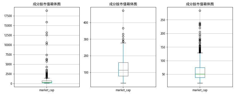 通过分析三大指数的箱体图,我们看到沪深 300 的样本离群情况最为严重,箱体图主体部分(25%分位到75%分位)被离群点严重压缩。中证 500 表现较好,离群点并不很多。中证 1000 也包含了部分市值较大的股票,主要原因是从 100 亿元到 300 亿元的某些股票可能由于市值上升过快,没能及时被编制更新到中证 500 指数中。