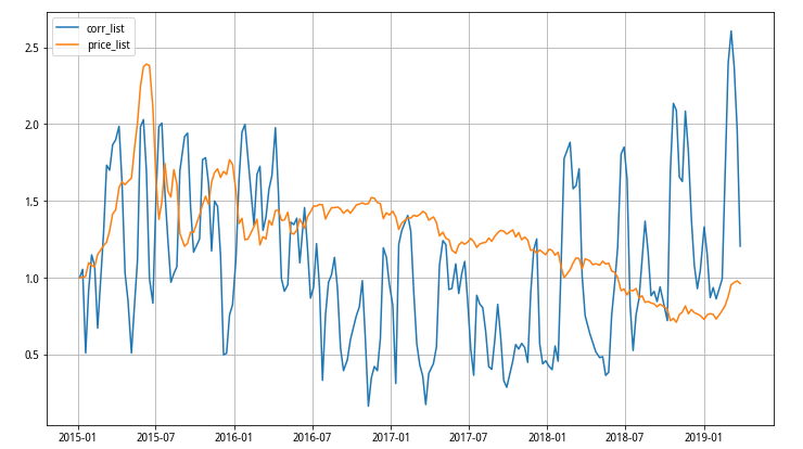 程序设计方面,首先通过 get_trade_days 获得一个日期序列,用于循环。然后通过 get_price 提取 20 日价格 DataFrame,再通过 corr().mean().mean() 实现相关系数计算、每个标的相关系数、均值的均值,获得每个日期截面一个值。我们将指数净值化处理,和这个指标绘制在一起,可以看到如图效果: