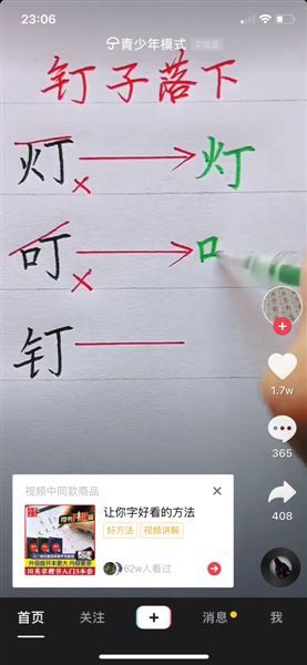 记者在用青少年模式浏览抖音所推送的视频时看到,不少视频内容上传者在展示绘画、书法等技巧时,左下角总会“恰到好处”地弹出视频中所使用的工具购买链接。