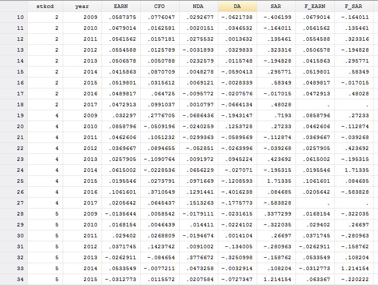 其中: EARNt+1 表示t+1年的会计盈余,EARN=(净利润+财务费用)/期初总资产 SARt+1表示t+1年股票的超额回报,是对单个股票市场回报进行规模调整计算出来的超额收益 CFOt表示t年的现金流量,CFO=经营性现金流量净额/期初总资产 DAt表示t年的操纵性应计,DA是使用修正琼斯模型估计的应计操纵性利润 NDAt表示t年的非操纵性应计,NDA是修正琼斯模型估计的预测值