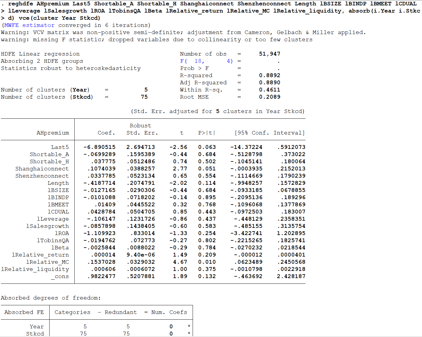 如下两图,用reghdfe code, 样本是daily data,同时控制公司和年份固定效应,并对同时对Accper(日期)和Stock code(公司)[vce(cluster Stkcd Accper] 进行聚类求two-way cluster standard error,但我发现,如果我对Stkcd 和 Year 聚类,虽然cluster 数量不同,但是结果相同,这是为什么呢?是不是说明控制失效了?以及由于为daily data,并发现了异方差,所以必须要对date和firm进行聚类然后求two-way cluster standard error嘛?图一:vce(cluster Accper Stkcd)