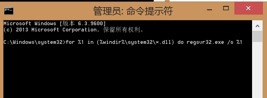 复制:for %1 in(%windir%\system32\*.dll) do regsvr32.exe /s %1 命令,在打开的管理员命令提示符窗口,(也可以点击左上角的小框,在下拉菜单中点击编辑) - 粘贴;