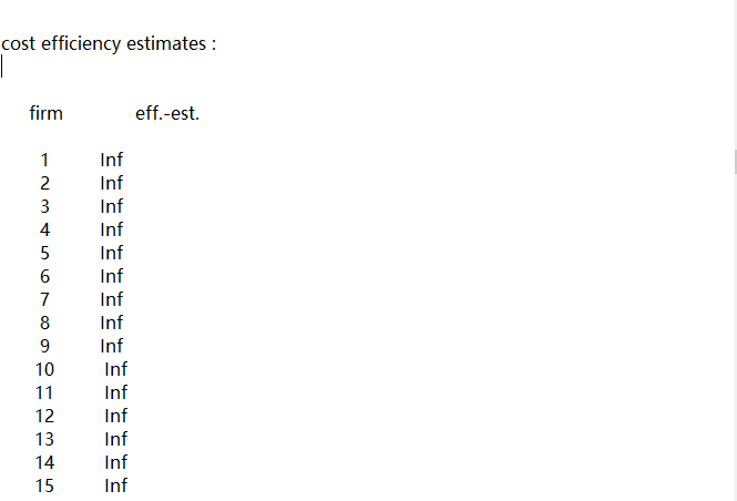 。自变量都是虚拟变量,因变量是非log后的数值,想研究自变量对因变量的影响。为什么结果里面cost efficiency estimates却都是inf啊?这个inf是什么意思呢?请问大家,问题出在哪里呢?