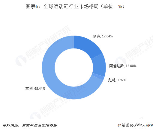 企业方面,全球运动鞋行业集中度较高。2016年,全球运动鞋市场中,仅耐克和阿迪达斯两个品牌的运动鞋营收规模占全球比重的29.64%,彪马运动鞋营收规模占全球的1.92%;安踏、李宁等中国品牌所占份额还较小。