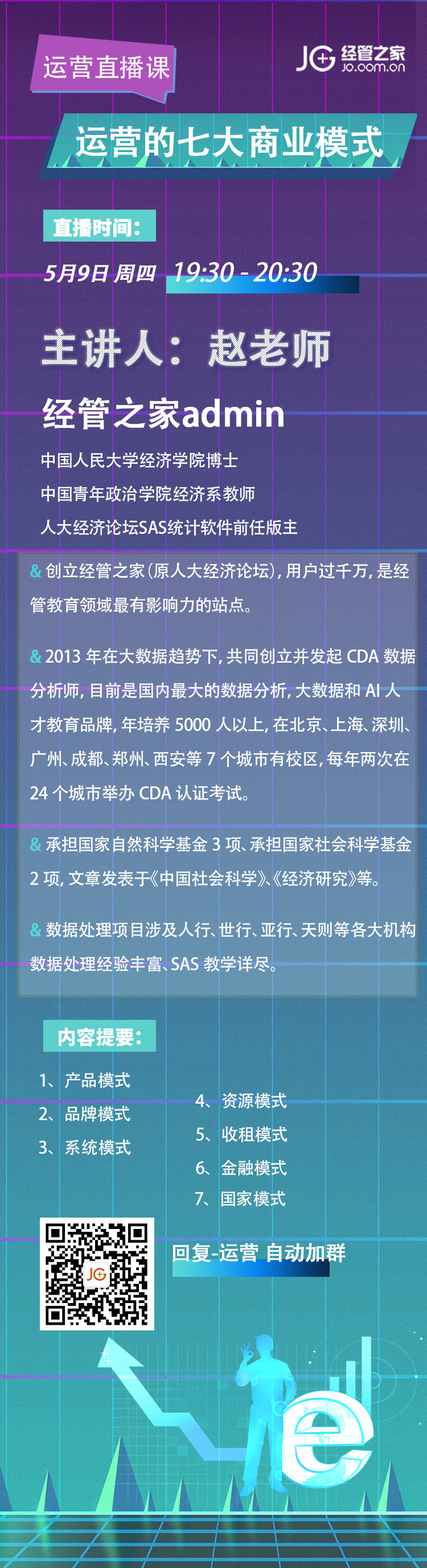 那就在5月9日(周四)19:30-20:30 参加直播吧,经管之家admin赵老师与你一起分享《七大商业模式之不同运营方法》!