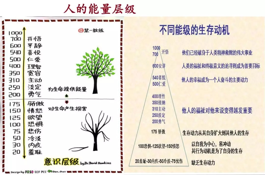 “意识层级”这一模型是一位医生和学者David Hawkins提出来的。他根据研究和观察把人所感受到的意识分成等级并打上分数。