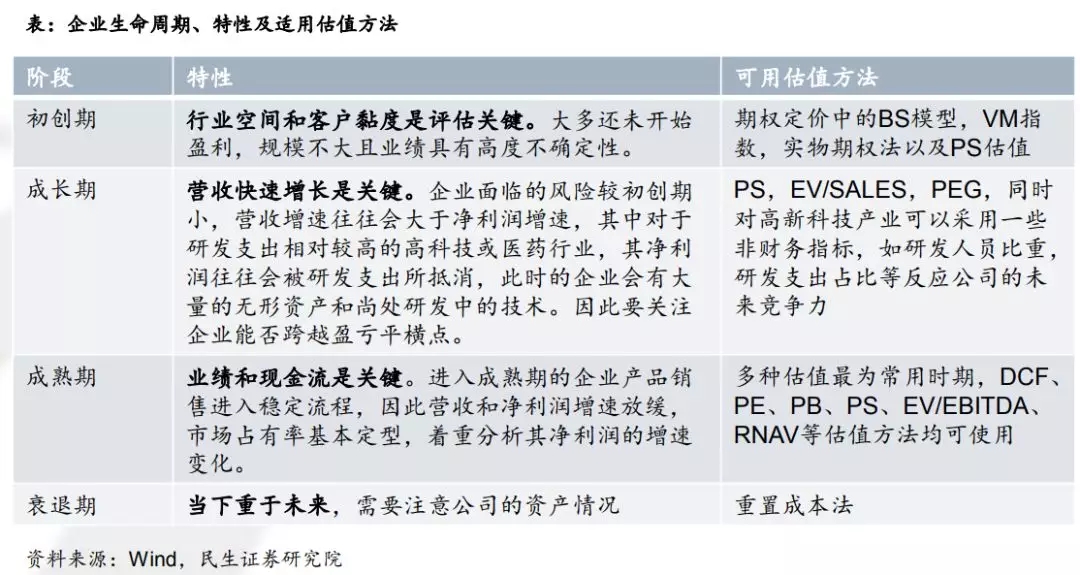 企业生命周期可分为初创期、成长期、成熟期和衰退期四个阶段。处于不同时期的企业有自身的营运特性,因此不能简单采用目前二级市场常用的PE估值法。